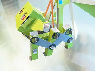 右下画像のプーリーを回すと、足が動き、連動して顔も動きます。